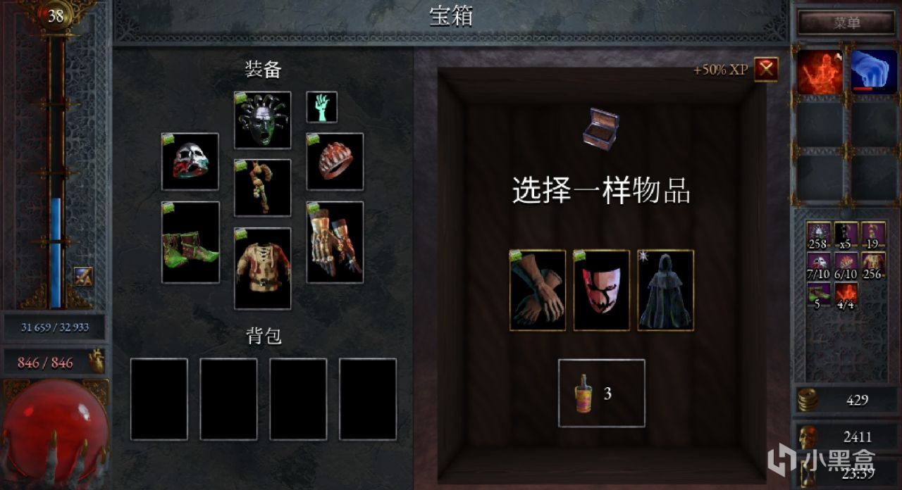 本作的基础装备共有8个栏位,玩家在局内战斗中击败精英和领主,有概率掉落宝箱,通过宝箱随机获取3选1,获取1件物品。