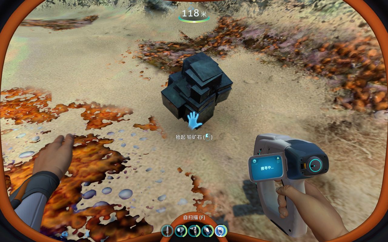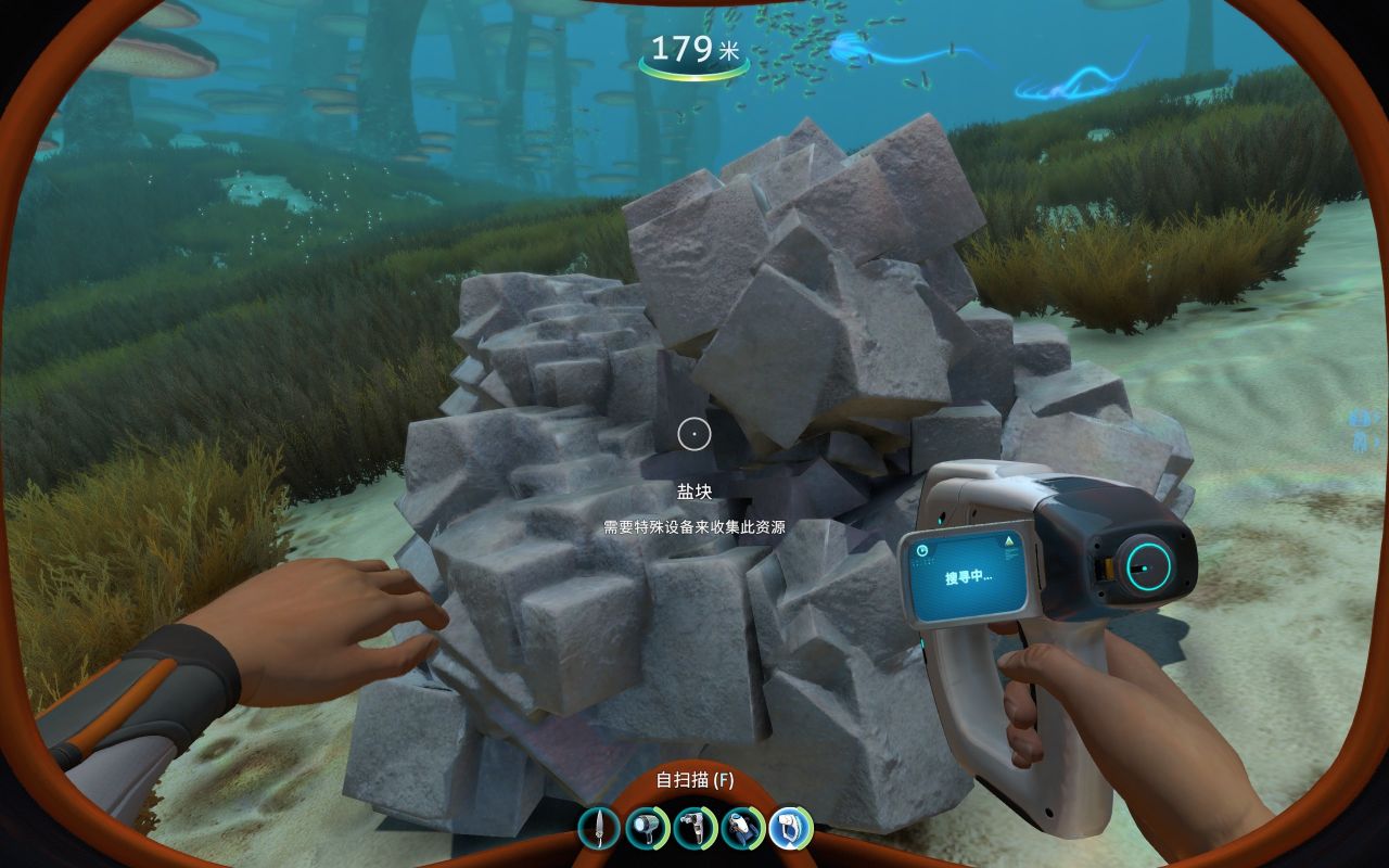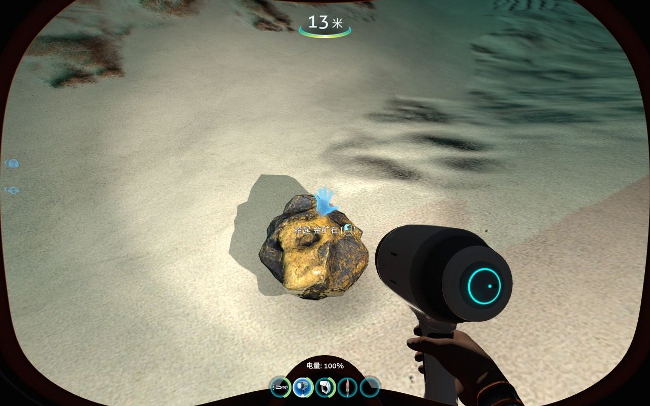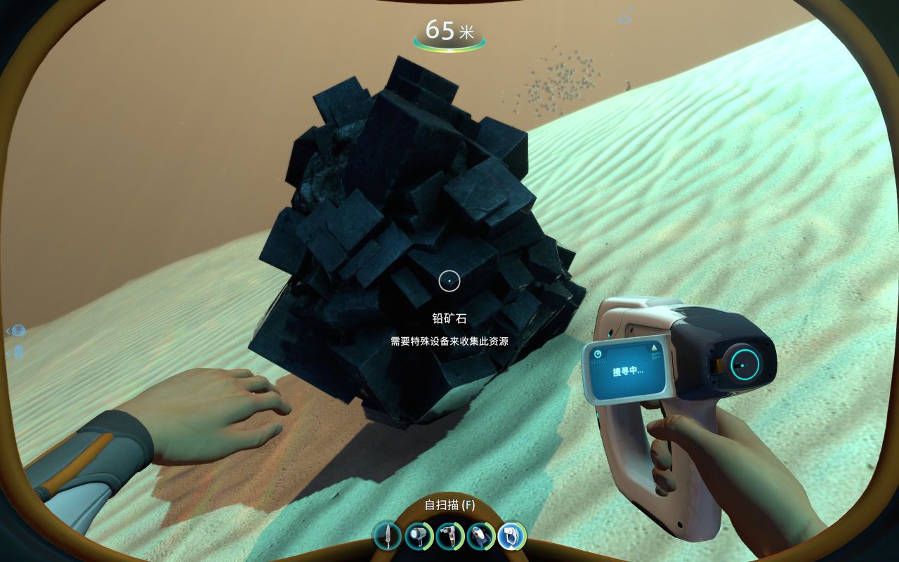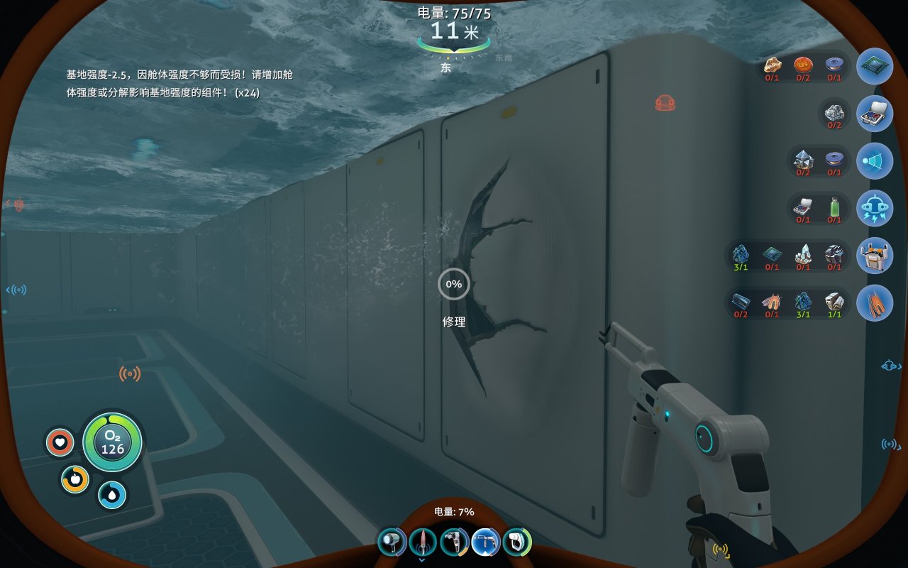 前期为了建造各种工具、机器、建筑……矿石的储备必不可少,钛、铜、石英、盐需求量大,金、银、铅、锂、钻石紧缺。但大部分矿石是一个整体,会提示你要特殊设备才能开采(如下图所示),其实这是需要用到海虾号的电钻手臂才能开采