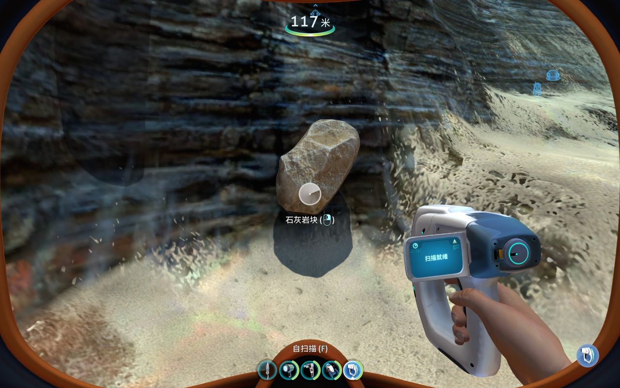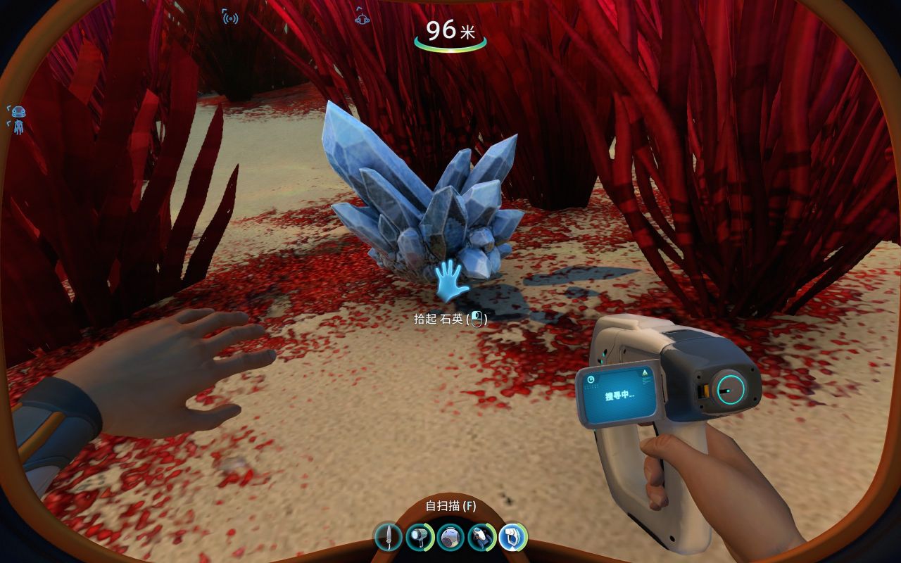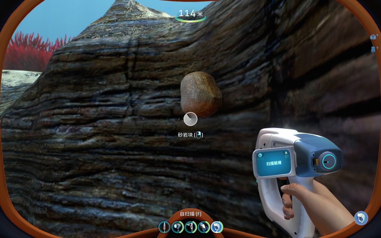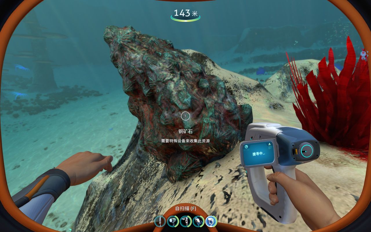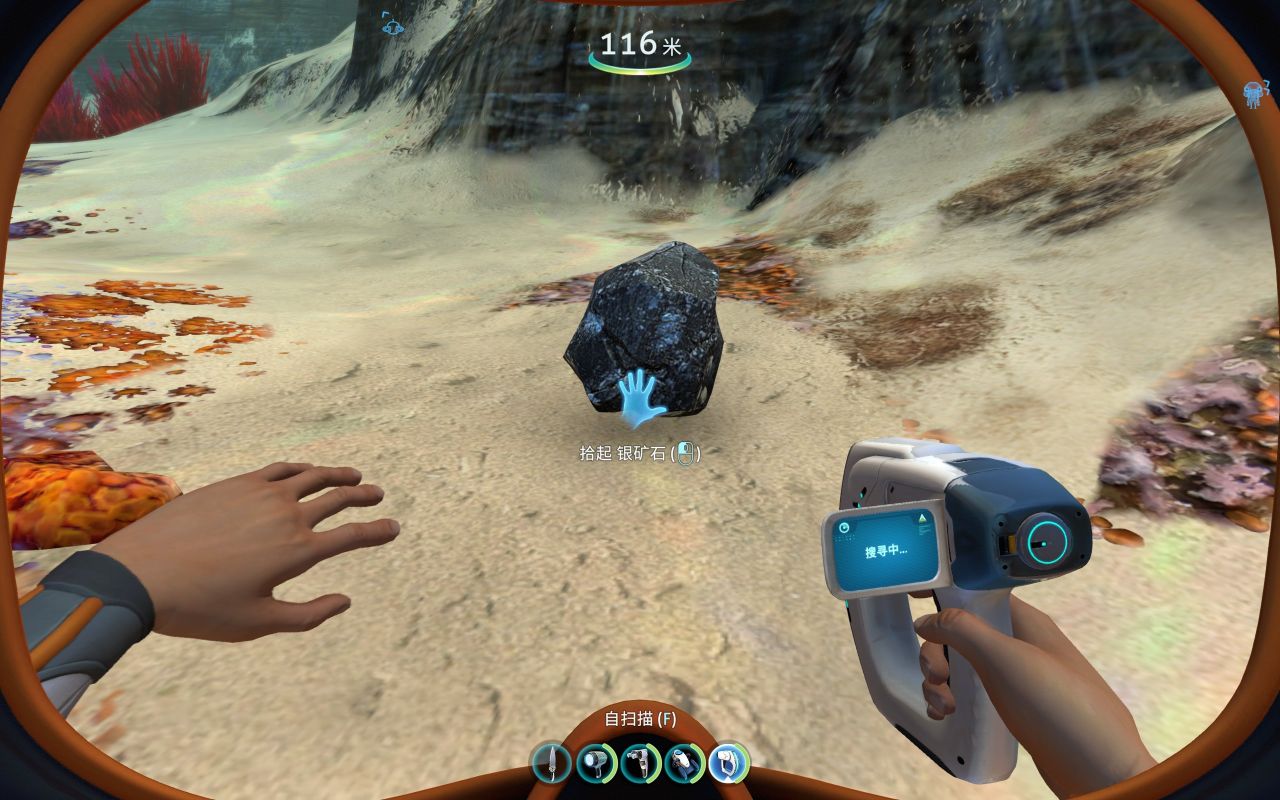 前期为了建造各种工具、机器、建筑……矿石的储备必不可少,钛、铜、石英、盐需求量大,金、银、铅、锂、钻石紧缺。但大部分矿石是一个整体,会提示你要特殊设备才能开采(如下图所示),其实这是需要用到海虾号的电钻手臂才能开采