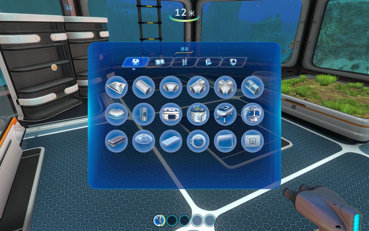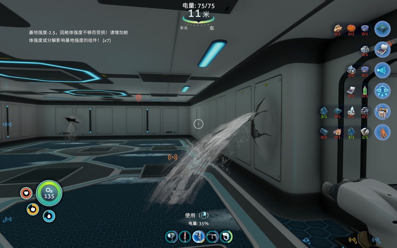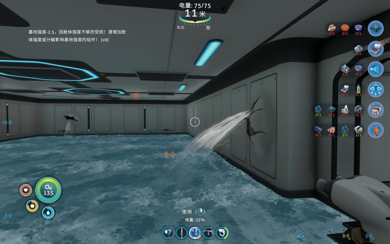 等度过前期的管道房后,就可以着手建造真正的基地了,但是注意,每制造一个建筑,都会降低一定量的基地强度,当基地强度变成负的,这时,你的基地就会被水压压坏,四处漏水(需要用地基或者加固板增加基地强度,当强度再次变成正的之后,用焊接器补好漏洞,就会自动排水了)