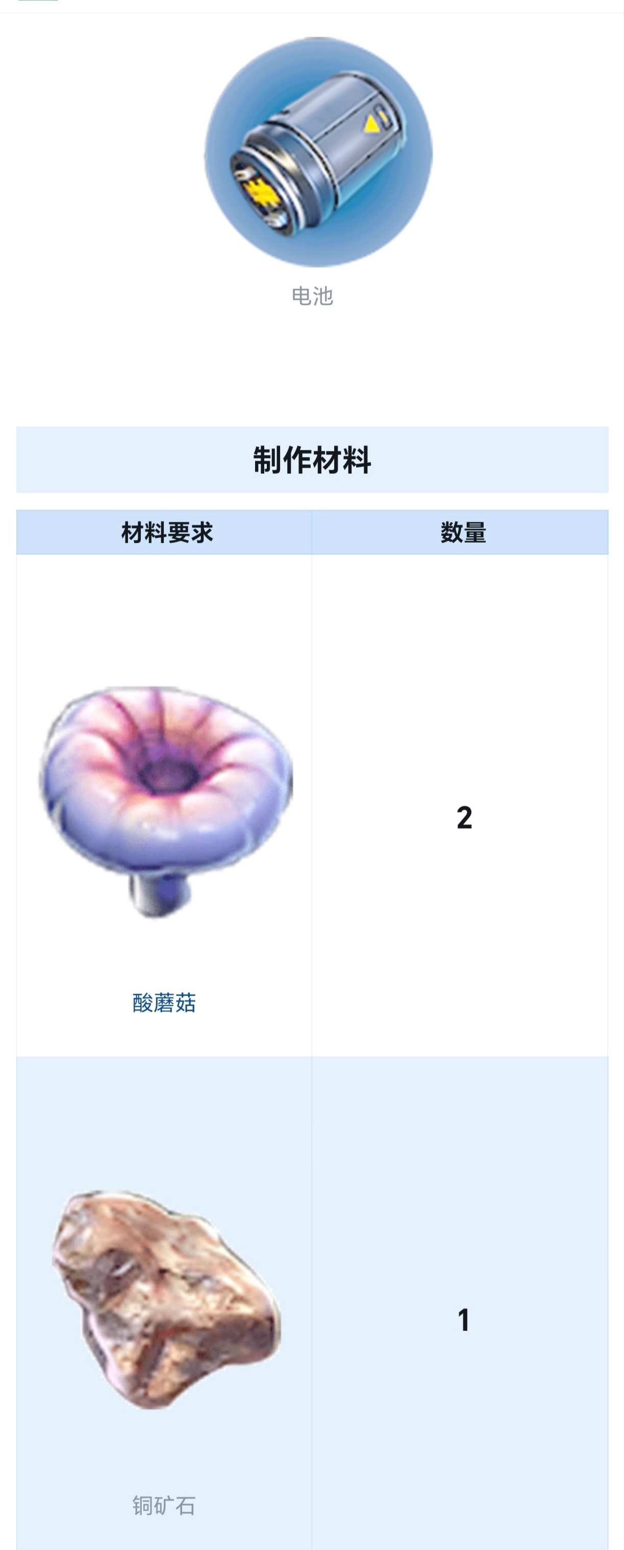 (2个酸蘑菇+1个铜)它是制造其他装备必不可少的工具,而且在前期没有充电器的情况下,装备也要勤换电池以维持工作,前期需求量挺大