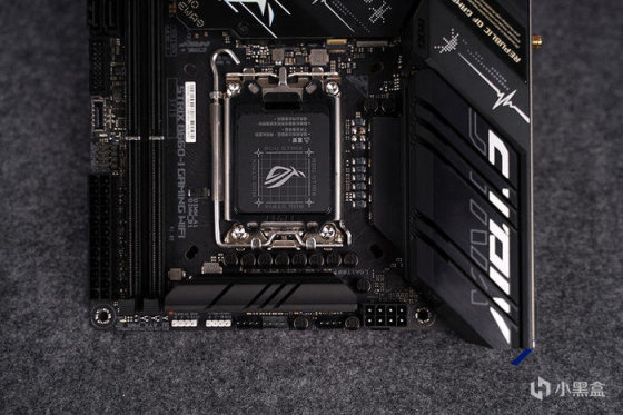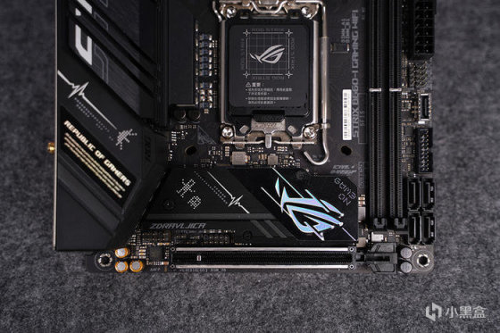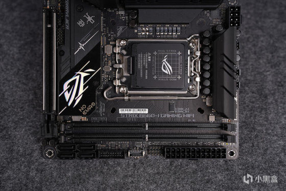 主板华硕 ROG STRIX B660-I WIFI,标准 MINI ITX 版型规格,黑色系外观,马甲斜面切割机甲风格,表面 ROG 图案文字修饰点缀,整体颜值比较的可以,定位于中端用户玩家。