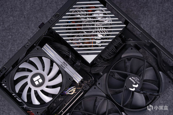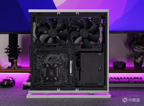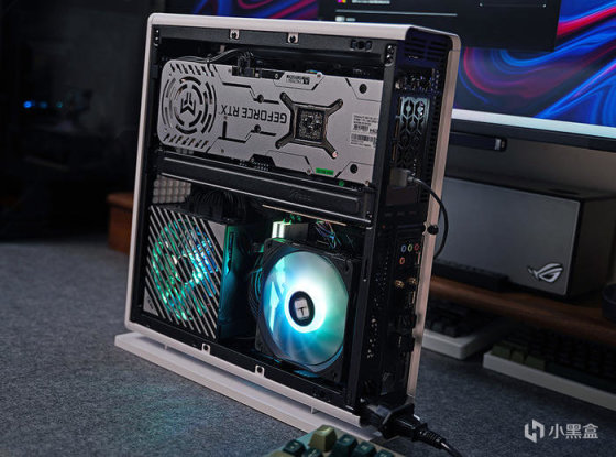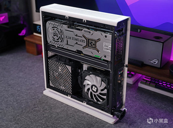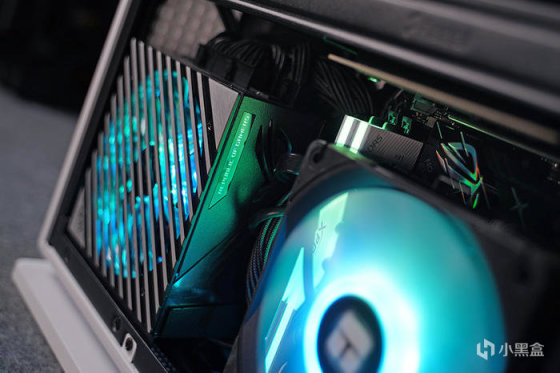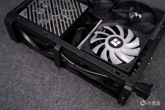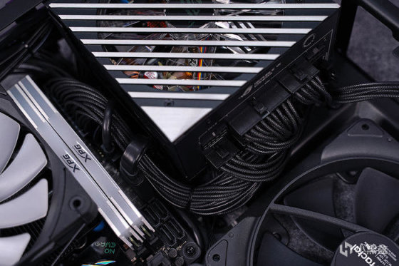 下头的主板和电源,电源可支持到 ROG LOKI 这种标准的 SFX-L 电源,结构问题并不支持走背线,相关线材只能从两者中间走。