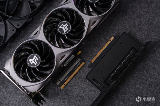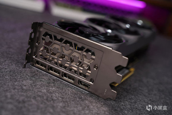采用 3 PCI 挡板设计,另附带双卡槽挡板可替换,表面镀镍处理,大面积几何开孔,用于增强进出风,对应给到的接口,分别为 3 个 DP 1.4a 接口及 1 个 HDMI 2.1 接口。
