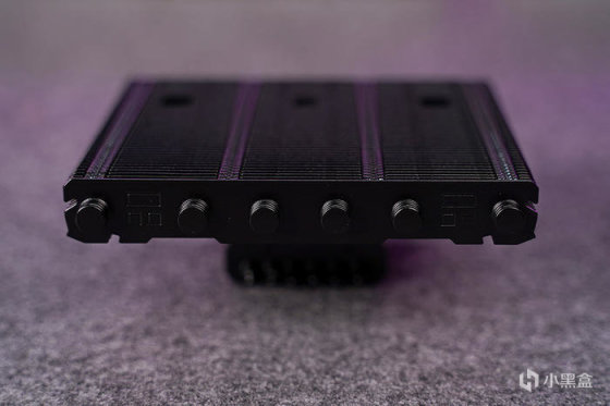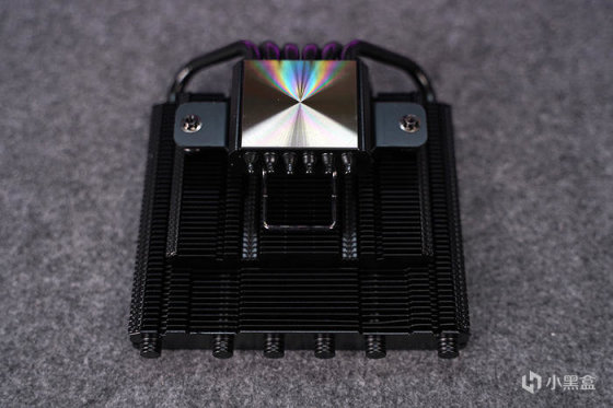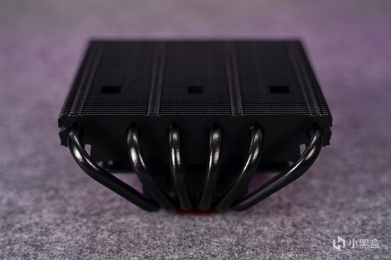 散热器本体尺寸为 123.5×120×52mm,全黑化处理,共有 45 片 0.4mm 全镀镍纯铝回流焊散热鳍片,搭配 6 根 AGHP Gen3 全电镀回流焊 6mm 热管。