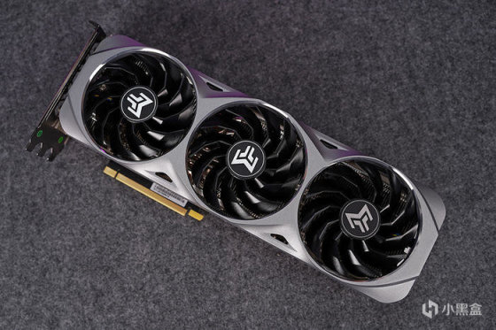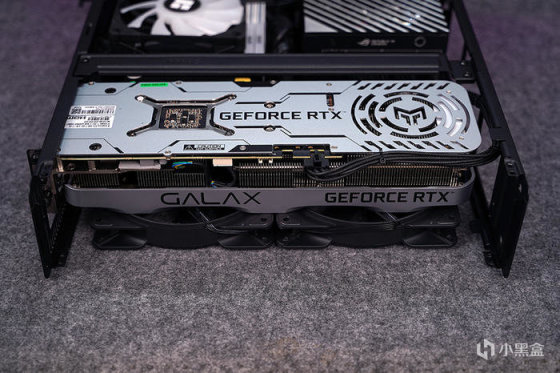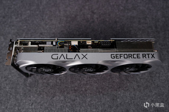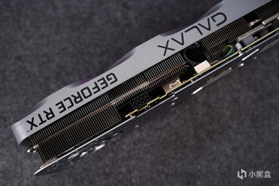 侧面,外露式鳍片设计,增强通风面积,鳍片严丝工整,偏居中位置带有影驰的 GALAX 英文图标,末端则是 NV 强制的 GEFORCE RTX 英文标注。
