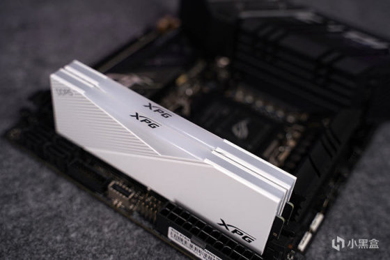 内存本体,搭配白色的散热马甲,由 1:1 单面厚度 1.95mm 的合金材质打造,外观简约又不失设计感,辅助斜纹线条修饰,DDR5 及 XPG 点缀,内侧附规格贴标。