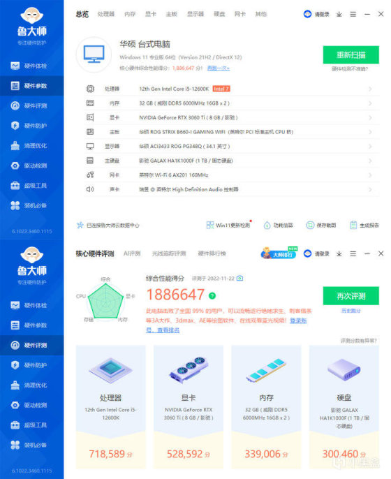首先看看鲁大师,具体的配置信息,给到的综合性能得分为 1886647。
