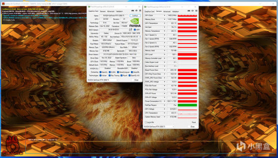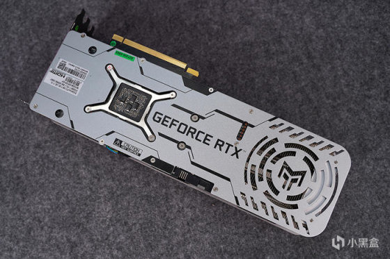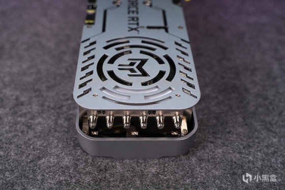 银灰色的金属背板,表面带有机甲条纹及 GEFORCE RTX 修饰,末端给到了大面积的镂空(造型为金属大师系列的LOGO图腾),通过贯穿式风流增强散热,这样更易于快速的带走热量。