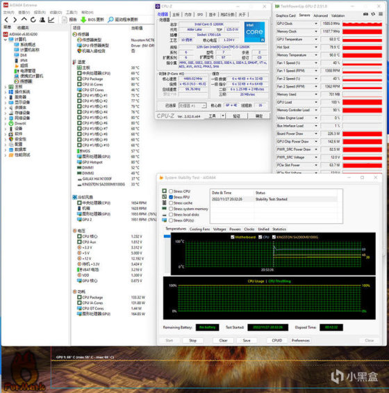 双烤,也是 10 分钟左右的测试,稍有上升.... CPU P-CORE 温度最大值 80°C,E-CORE 温度最大值 68°C,显示功耗 134W 左右,显卡核心温度 68 度(结温 79.9 度),显存温度 90 度,显示功耗 226W 左右。