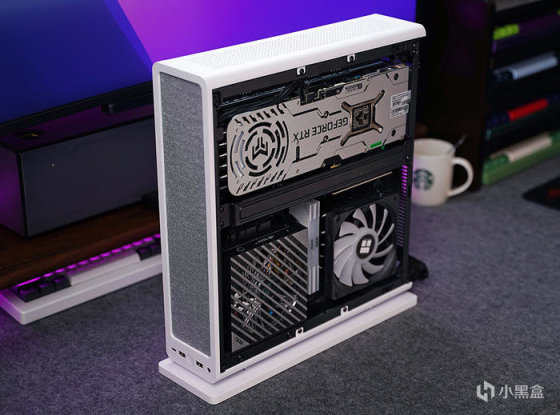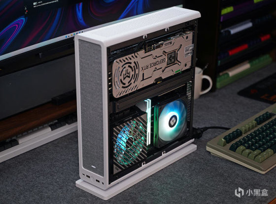 无灯状态下内部的装机效果展示,除竖直摆放外,另支持水平放置,机身尺寸 374×395.4×110mm(垂直形态)、360×115×375mm、体积大差不差约为 16 升左右吧。