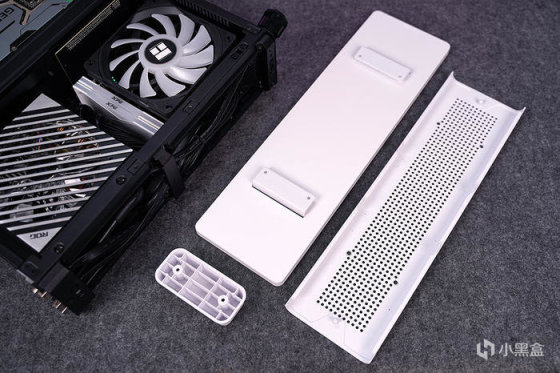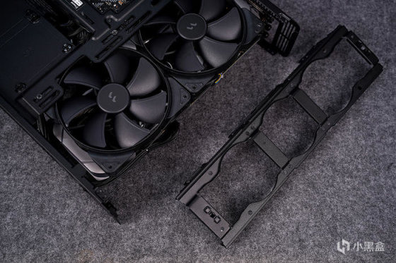 里头塑料散热孔面板,螺丝固定前置装饰布面,喜欢的话,里头的布面应该是可以替换,面板对应机身位置可以支持安装三颗 80 风扇加强散热。