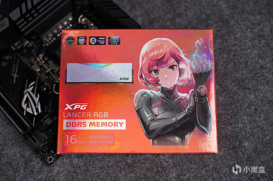 搭配内存选用的是 XPG 龙耀 LANCE RGB DDR5 16G×2 6000MHZ 白色款,红色包装,正面印刷有内存本体及二次元卡通人物,规格型号及四大主板厂商的灯光标识。