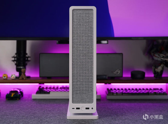 机箱前面板设计,迎合家居装饰风格,覆盖了一块浅灰色的网布修饰,且这东西同时具备有一定的通风效果,即当防尘网使用,下置 I/O 接口,从左到右分别为:Type-C 接口、USB 3.0 ×2 接口、居中开机按键、3.5mm 音频复合接口。