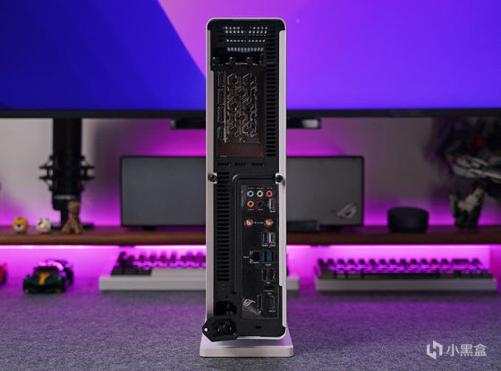 电源尾部,位置搭配有一个 败家眼 ROG 点阵铭牌(可透光),其它就常规的 AC 开关,一侧大面积开孔出风设计。