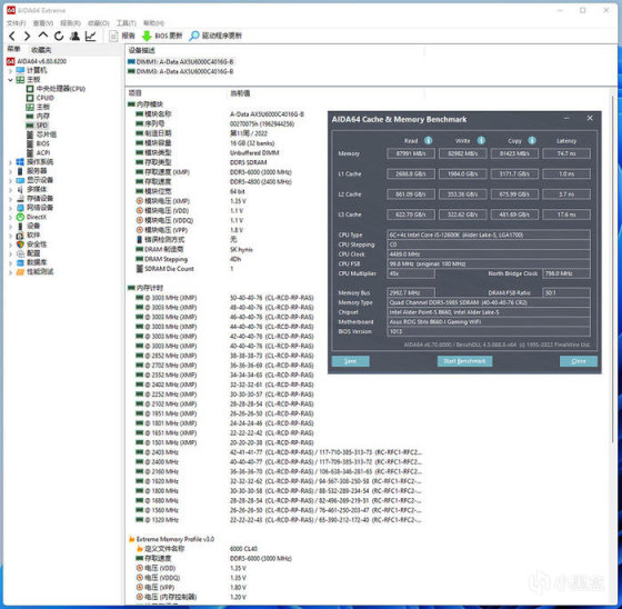 XPG 龙耀 LANCE RGB DDR5 16G×2 6000MHZ 白色款,AIDA64 内存测试。