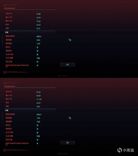 赛博朋克 2077 2K 分辨率及 1080P 下 BENCHMARK 测试表现,均开启了 DLSS(平衡)。