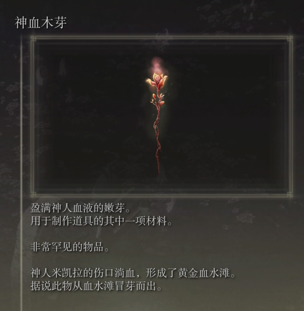【神血木芽】神人米凱拉的傷口淌血,形成了黃金血水灘,據說此物從血水灘冒芽而出。