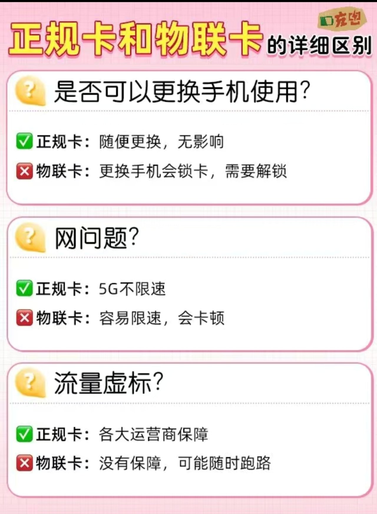 除了以上特点外,正规流量卡与物联卡在使用体验上也有很大差别。正规流量卡网络5G不限速,流量可以在官方渠道查询,还可以随意更换手机使用。而物联卡则容易出现限速卡顿、流量虚标等问题,甚至换手机使用还会导致锁卡。更重要的是,正规流量卡有三大运营商作为售后保障,而物联卡则没有售后保障,随时可能面临无法使用的情况。