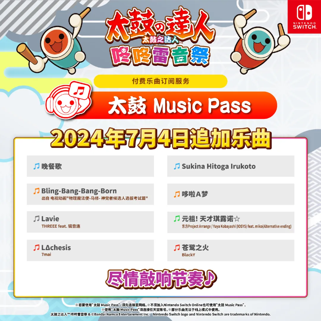 《太鼓之达人 咚咚雷音祭》会员订阅曲库,7月新增歌曲现已更新。