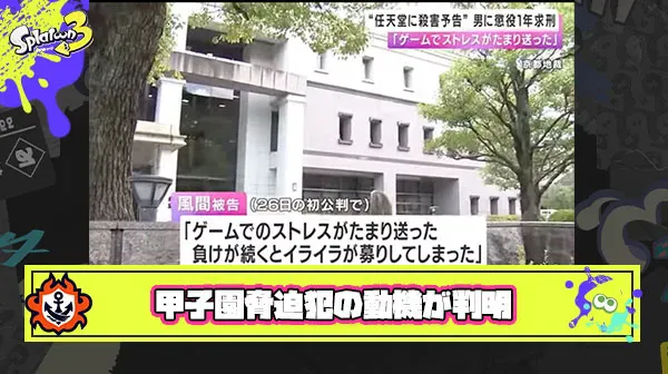 去年多次向任天堂发出威胁信息,导致任天堂线下活动临时取消,造成损失金额高达7亿日元的男子 风间健心 公布了他的作案动机:自称因为游玩《splatoon》导致心态失衡。