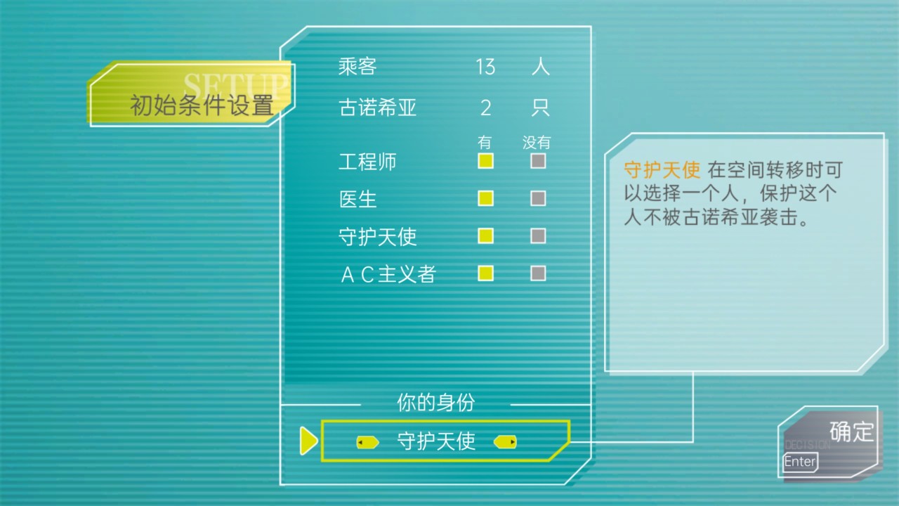 這麼多身份是不是感覺已經眼花繚亂?沒關係——在教學階段的十多個輪次以後,幾乎所有的內容都可以自定義,包括了參與的人數、各種身份卡的人數以及你的身份,所以不用擔心太過複雜的角色設定會讓自己找不到北,對於新手玩家而言,初始8人2Gnosia的配置是相對比較方便上手和推理的。