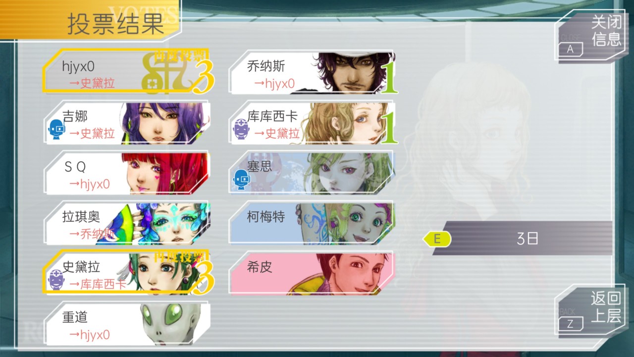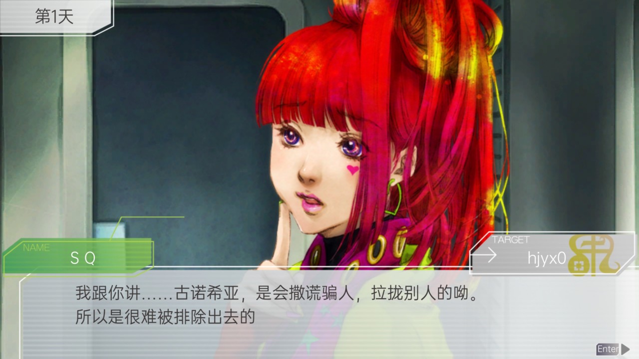 那麼它的趣味性體現在哪呢?儘管不同於《Among us》這樣的“真”狼人殺,但相對於《Raging loop》這樣的純文字小說而言,《Gnosia》的遊玩內容中“狼人殺”的佔比和重要程度要高得多。