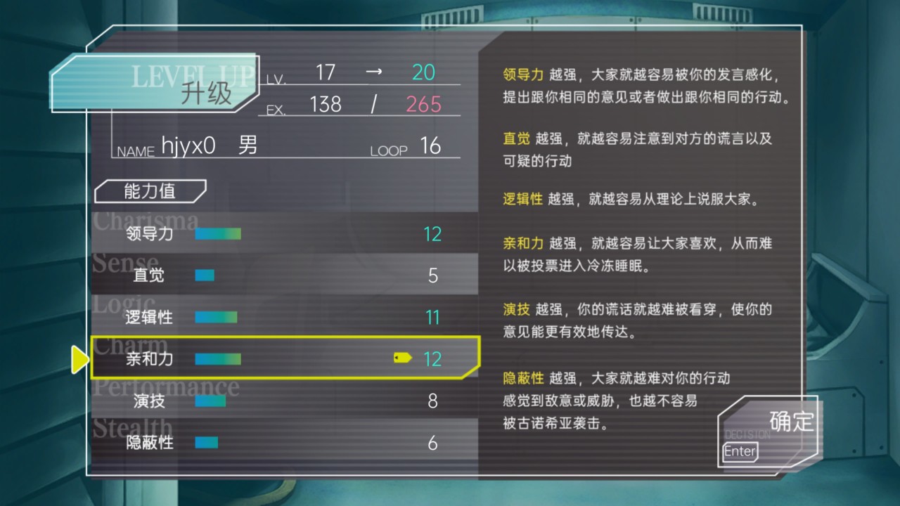 而在《Gnosia》中,你作爲“主角”的行爲有着幾乎是絕對意義上的自由,遊戲也沒有絕對意義上的失敗可能性,在不斷的循環中,你可以強化自己的屬性,去讓一些目標的達成更爲容易,也就是說:單局“狼人殺”的成敗並不會是天堂或地獄的二選一結局,只是會讓你推進劇情的腳步更快或者更慢了一些。那麼——