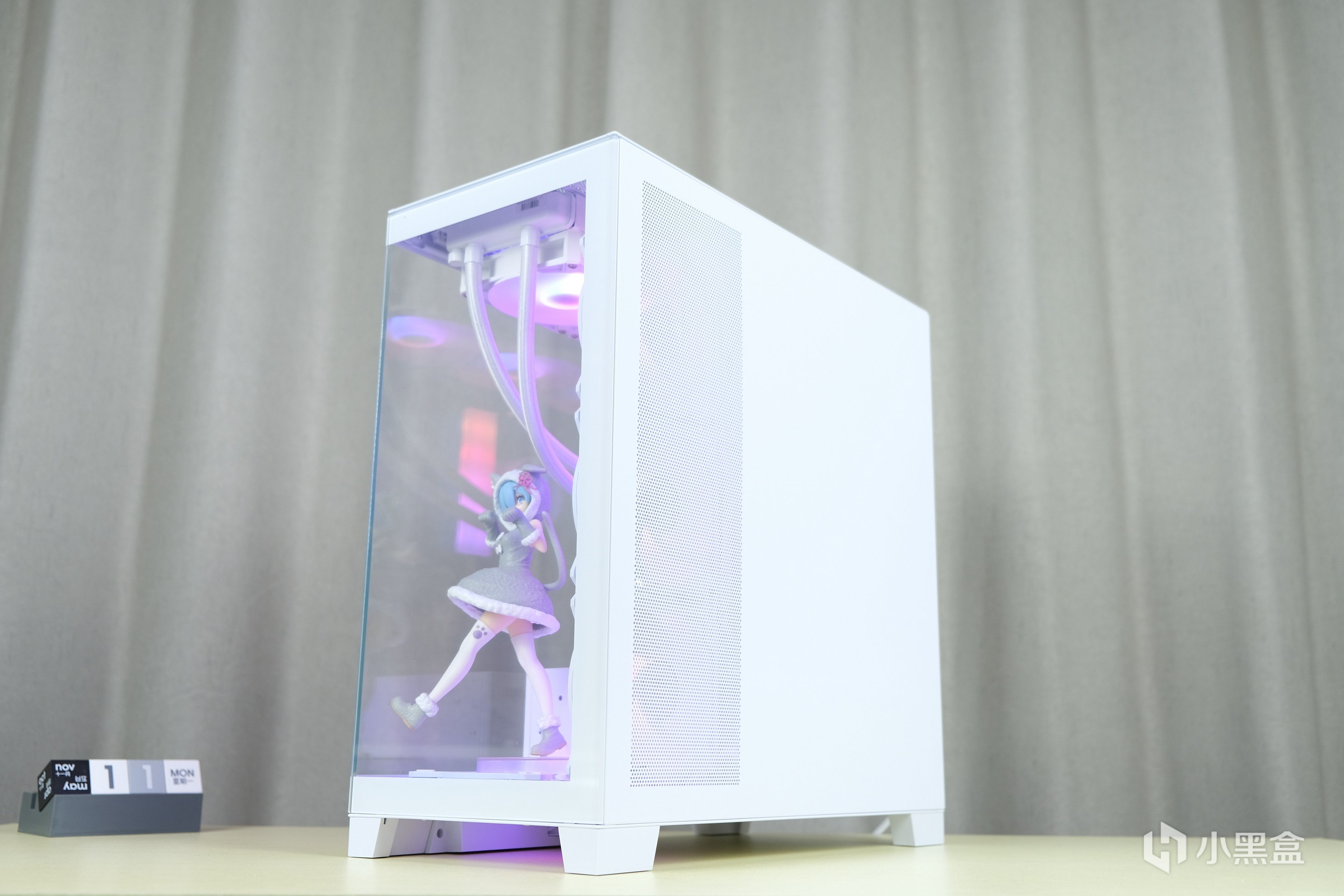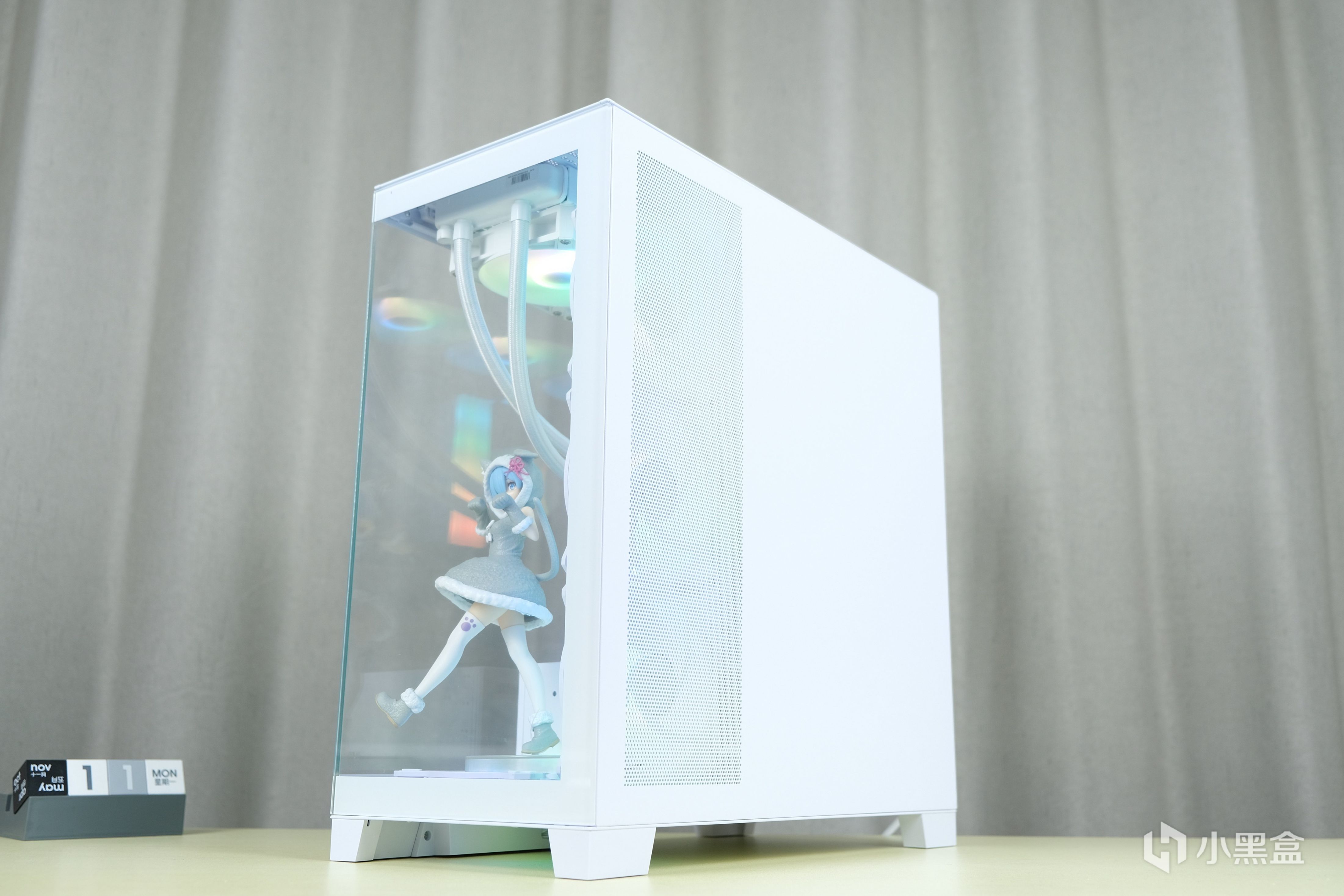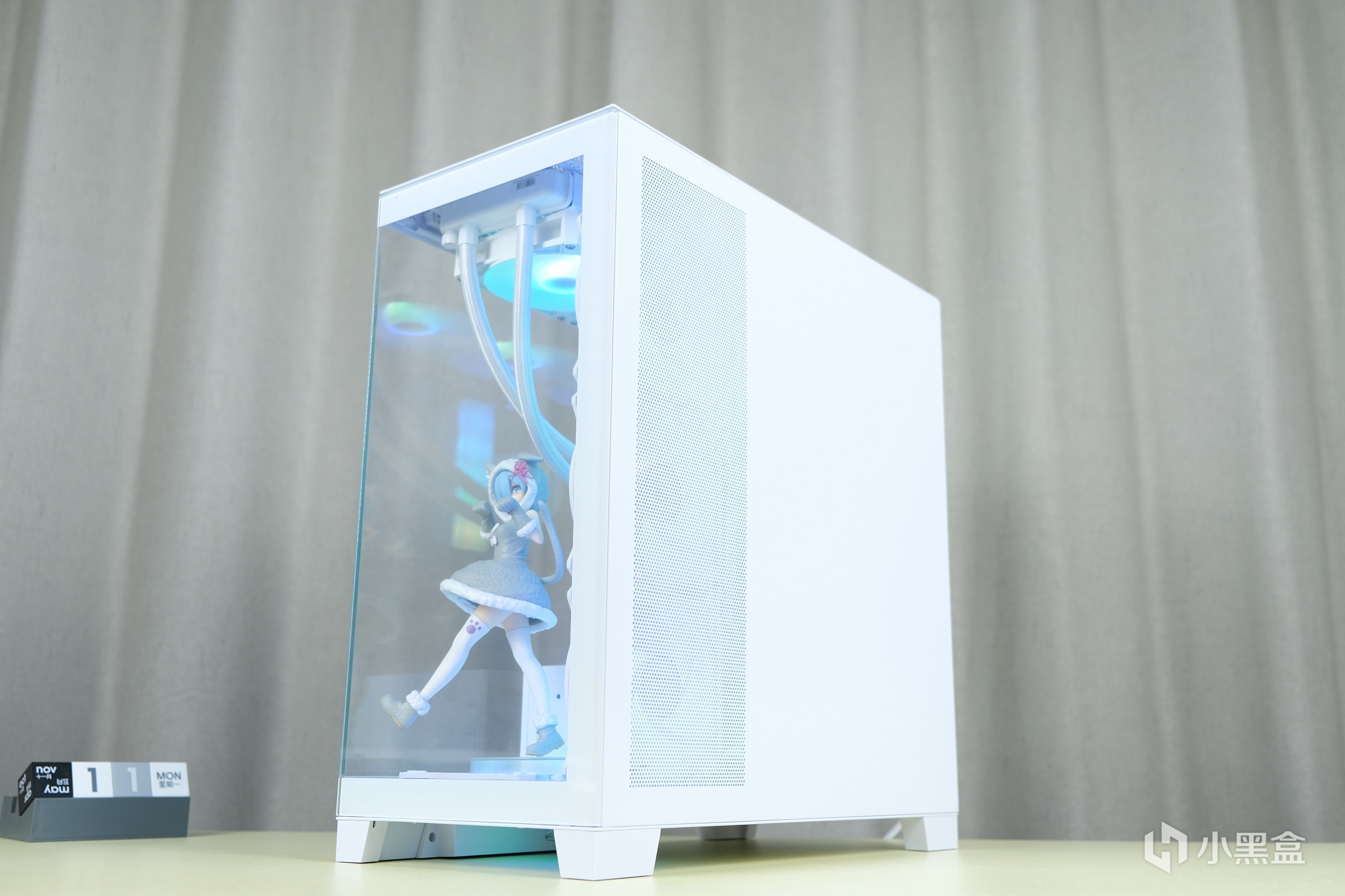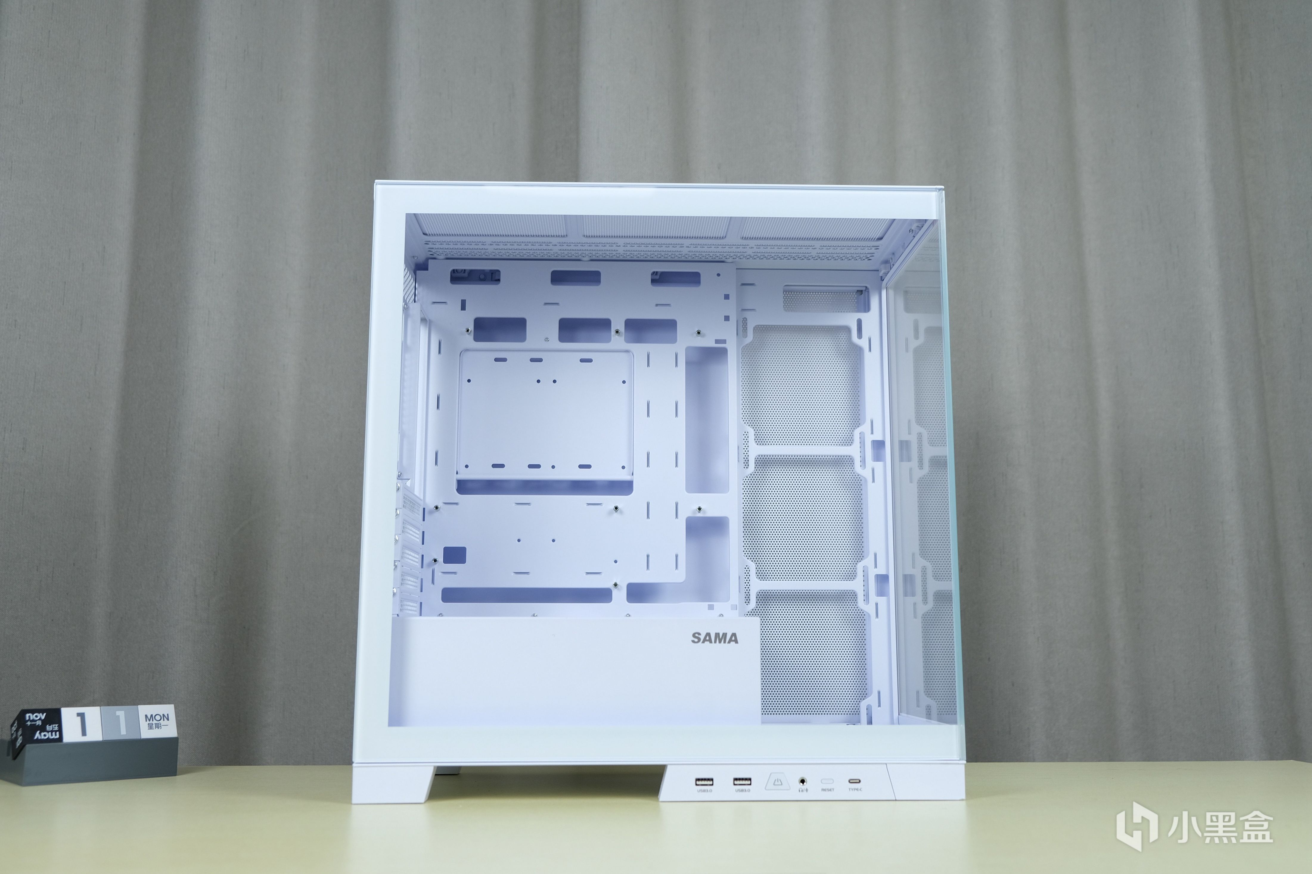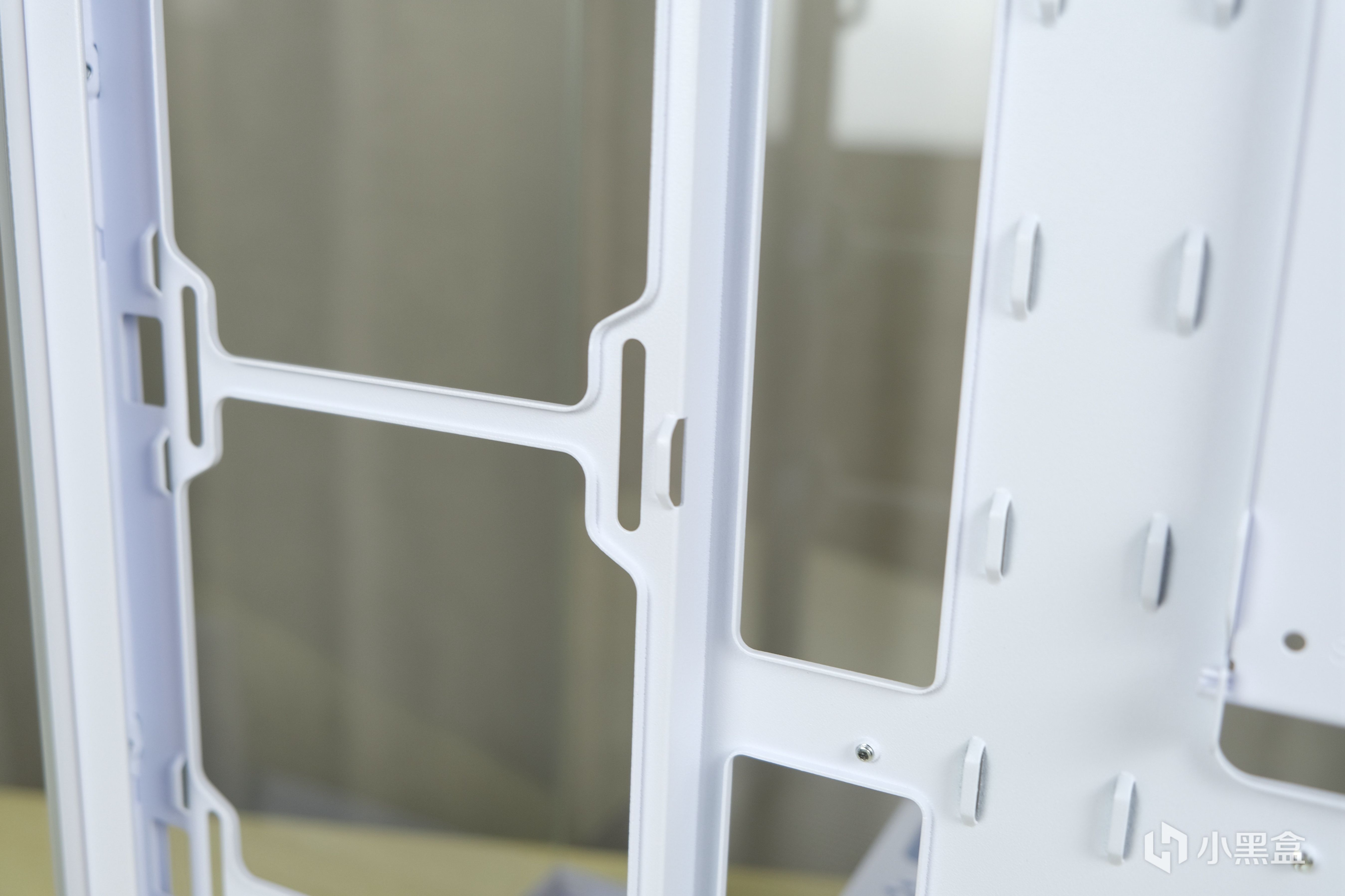 先马新镜界海景房机箱有黑白两款,这次上机的是白色款,颜值更佳,新镜界在初始状态下与一般海景房机箱别无二致,正面与侧面是全透的无孔钢化玻璃,视觉效果相当不错,当把两块侧透玻璃取下时可以发现玻璃间的支柱采用螺丝固定,可以取下支柱进一步提高视觉效果,打造270°全透、无遮挡、独一无二的海景房。