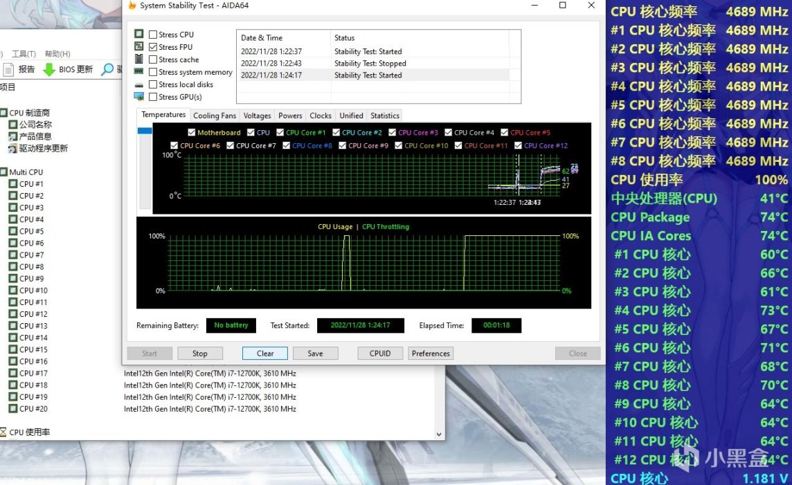 拷机也是少不了的,i7-12700K在AIDA64的FPU模式下拷机数分钟温度最高时仅74℃,可以说相当不错。