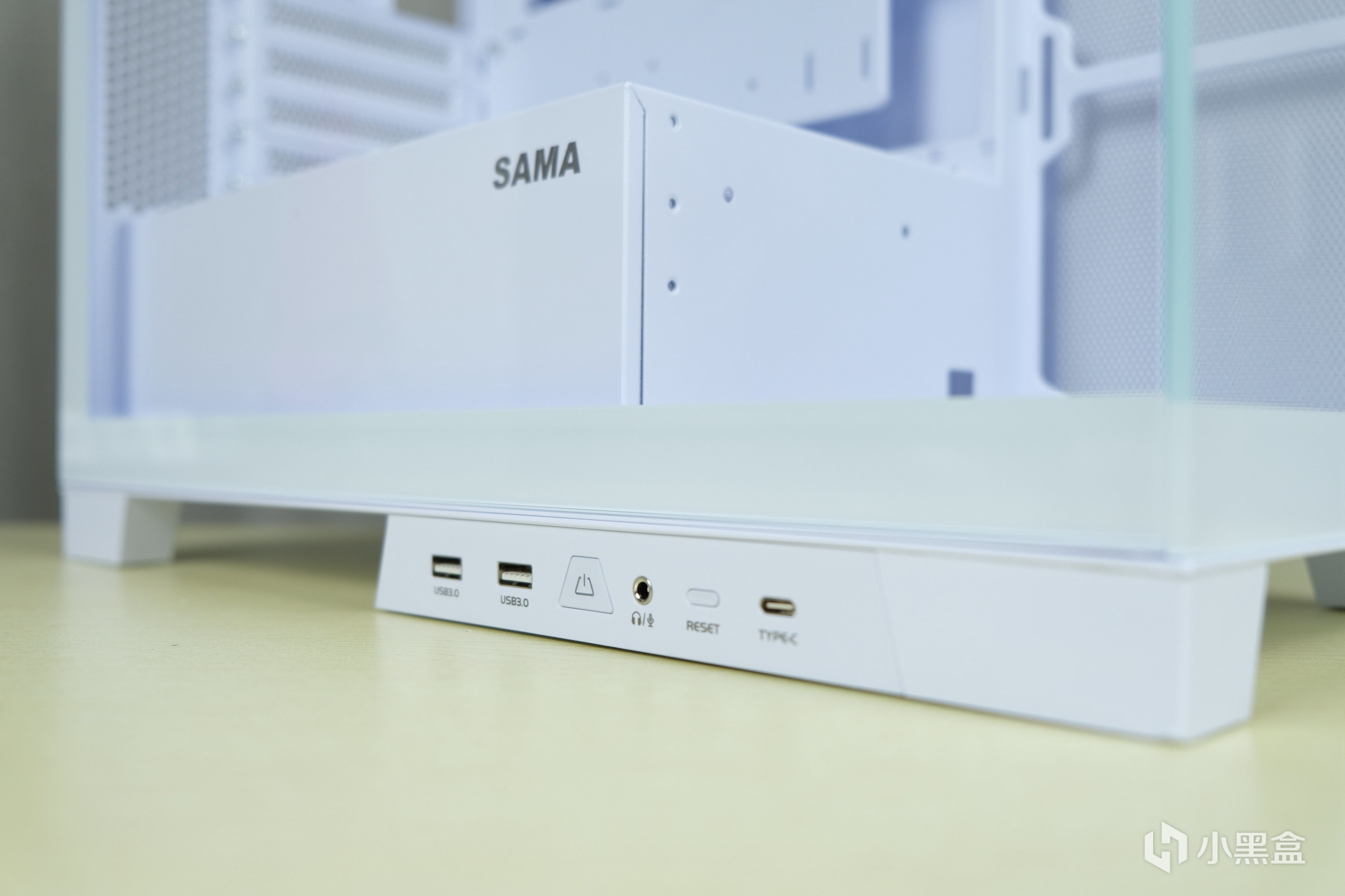 ▼I/O接口方面。新境界除了开关、重启、耳麦,还有着一个TYPE-C和两个USB3.0接口,堪称全接口。而且比较有意思的是I/O接口面板的位置,通常来讲海景房都是放桌上的,I/O接口位置自然是放底部,新镜界在此基础上还做了一个比较实用的小设计,I/O接口面板不仅可以安装在侧面,也可以拆卸安装在正面,可以更好的支持各种摆放使用习惯,相当实用。