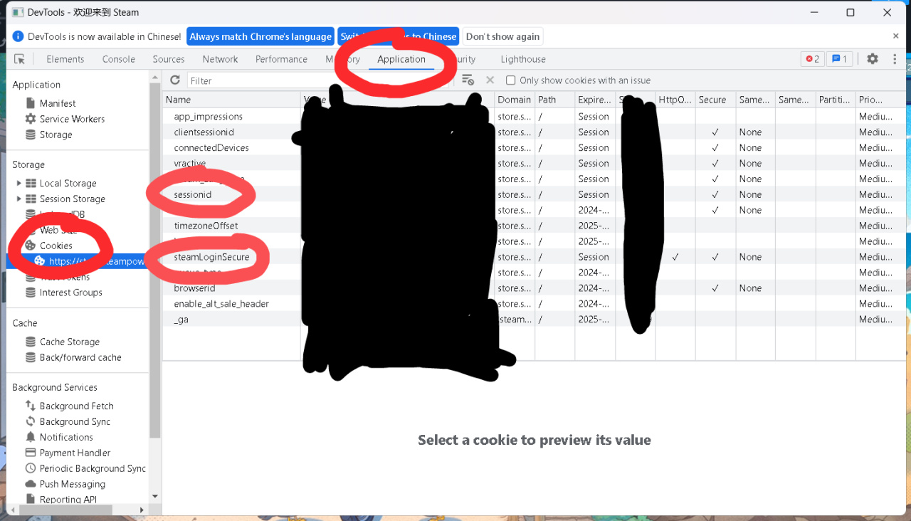 在控制檯頁面上面一欄中點擊Application,在左側找到Cookies並點擊出現的新鏈接,在主界面中找到sessionid和steamLoginSecure,複製其value欄的內容。