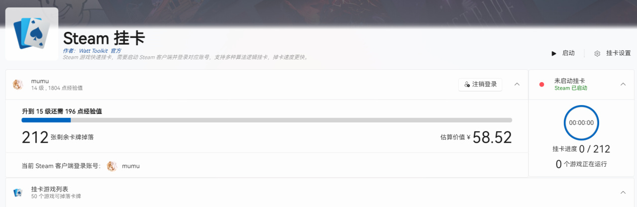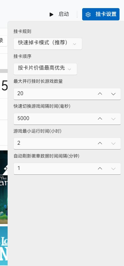 點擊掛卡設置,調整合適的參數,建議掛卡順序爲“按卡片價值最高優先”。點擊啓動開始掛卡(掉卡有最低遊玩時間限制,達到一定遊玩時間後,啓動遊戲纔會掉卡)。