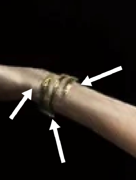 結合線索①:娜娜亞的手臂上佩戴的金色環爲封閉性圓環,且數量三四個不一樣,甚至粗細、打磨程度也遠不相同。