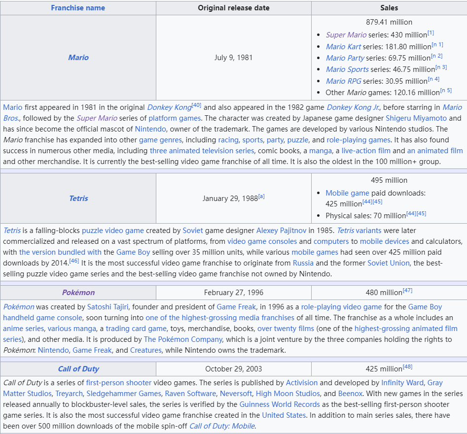 即便是把标准放宽到“系列游戏”的统计渠道上,马力欧系列同样是那个屹立在山巅的巨无霸,以8.79亿份销量排名榜首,第二位的俄罗斯方块距离它差不多有接近一倍的差距(4.95亿)。此外,任天堂旗下的宝可梦系列、塞尔达传说系列,也是游戏历史上能够突破1亿销量的游戏系列。
