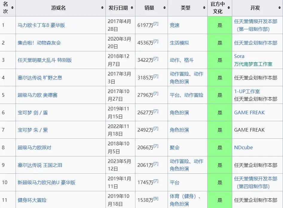 如果参照目前的Nintendo Switch平台,销量超过3000万的游戏为:《马力欧赛车8》、《动物森友会》、《任天堂大明星大乱斗特别版》、《塞尔达传说:旷野之息》