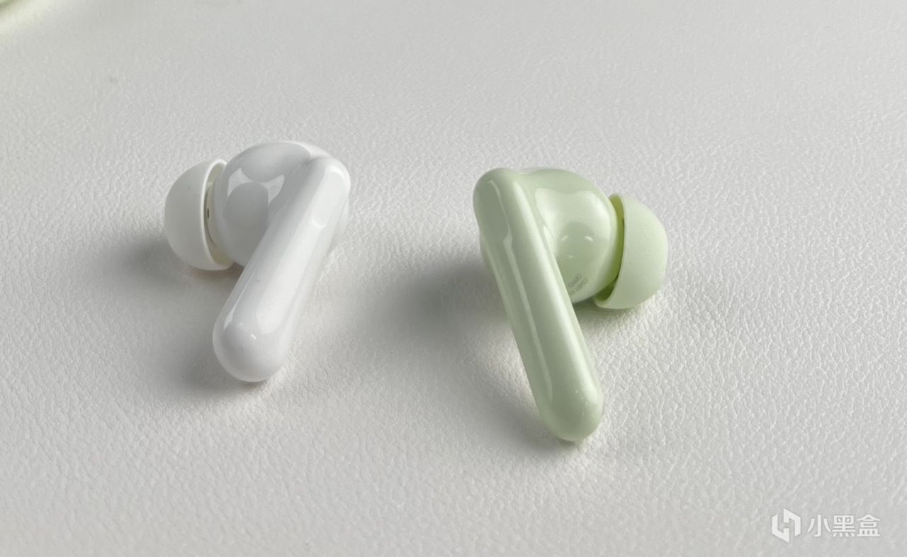 耳機也是對應的綠色,沒有任何額外的撞色設計,上下一個顏色,耳柄爲細長型,長度中規中矩,光滑亮面設計,觸控功能鍵區域做了凹陷處理,質感較爲高級。