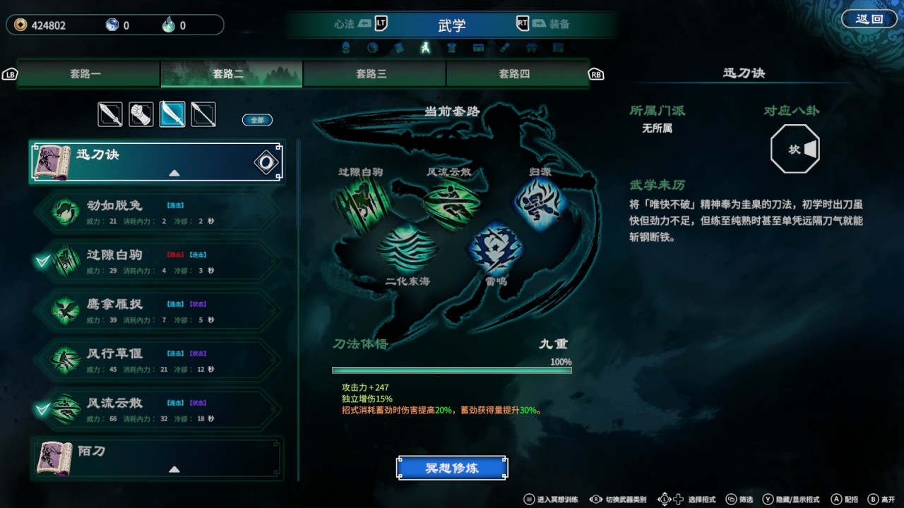 武学:游戏中共有二十余种心法武学,武学招式分为刀枪剑拳四类,可以被自由搭配在四个套路栏中,在战斗中随时切换。