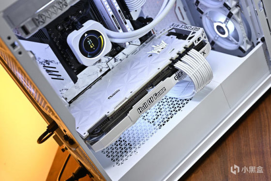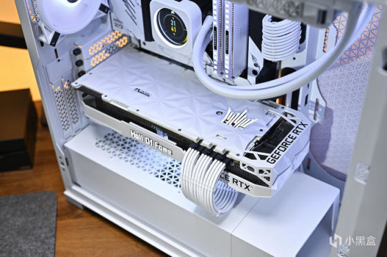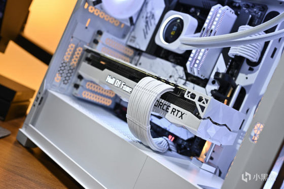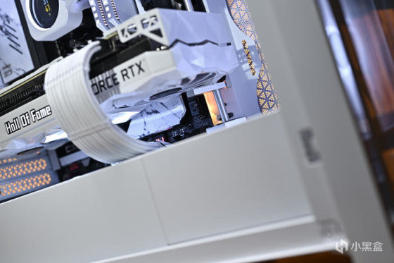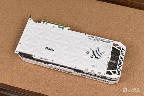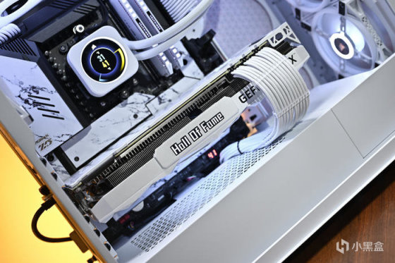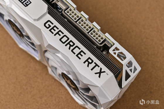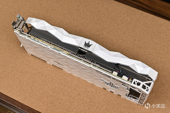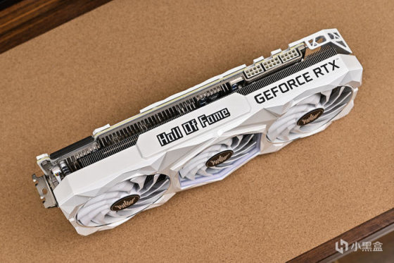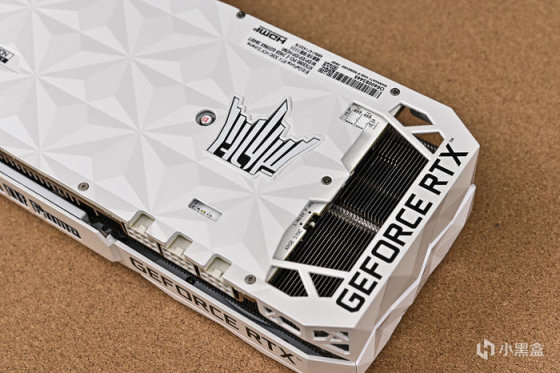 显卡另一侧导风罩中央是影驰名人堂标识,可以看到显卡PCB也做成了全白色,正装方式安装显卡纯白效果更佳,中间可以看到裸露的厚实且密度非常高的散热鳍片和热管,显卡 PCB 均被金属散热片全面覆盖,保证每一个散热元件散热需求。