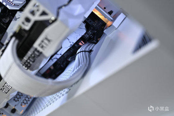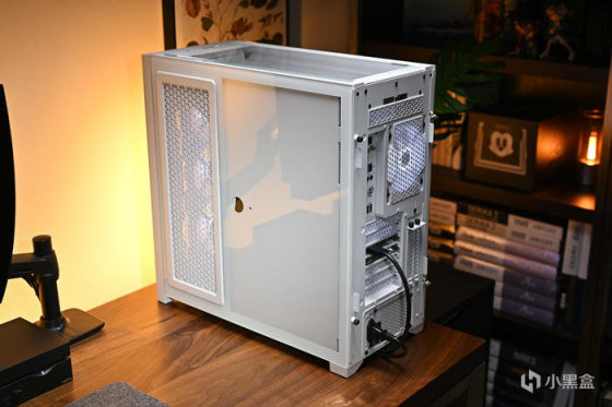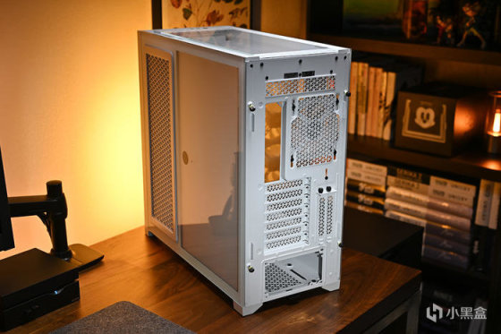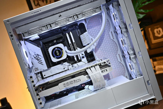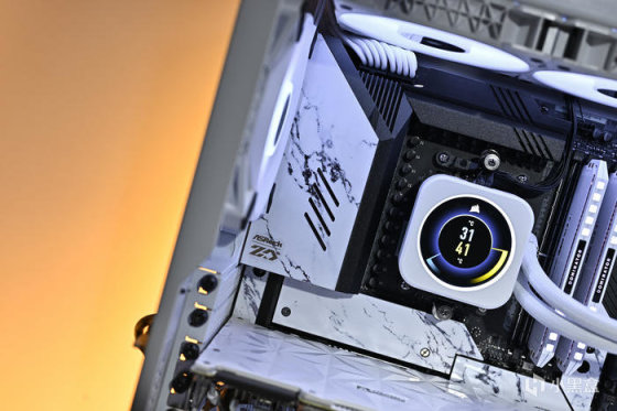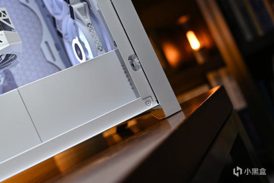 主板侧展示。侧面高透钢化玻璃侧板,白色包边和机箱颜色融为一体。