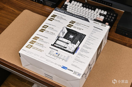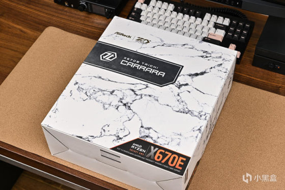 主板选择了华擎 X670E Taichi Carrara 20周年特别版。外包装非常巨大,表面采用主板同色的大理石纹理,左上角标注了 ASRock 20th 特别版标识,下方灰色区域标注了主板型号,右下角是 AMD X670E 芯片组标识。