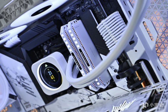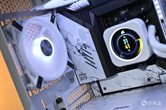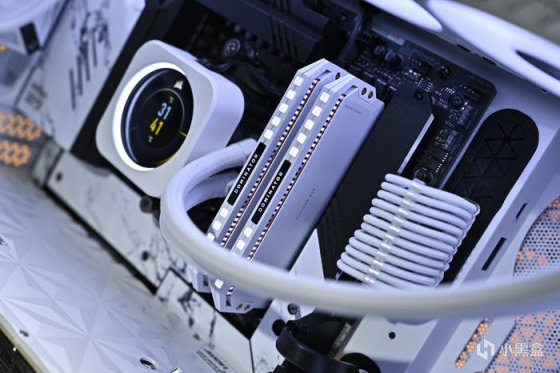 整机白色调,四面高透钢化玻璃盖板,搭配白色 RGB 灯光,辅以冷头屏幕少许金色、蓝色,以及主板南桥侧面金色 RGB 点缀。