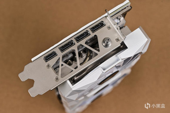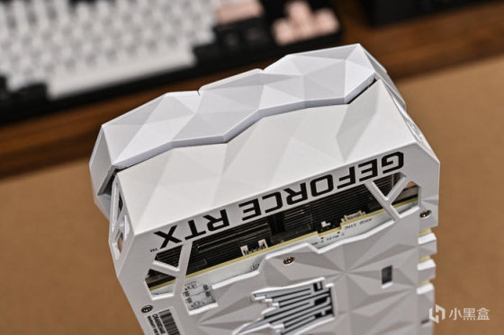 显卡的一体式金属背板和导风罩设计一脉相承,同样的采用钻石切割设计,显卡尾部镂空区域则允许气流贯穿散热鳍片,最大化提升散热性能。