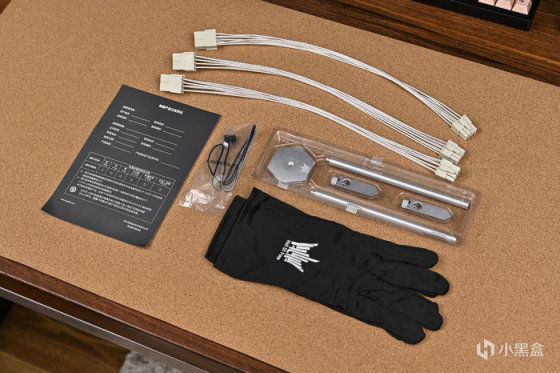 附件非常丰富,除了支持说明书合格证外,还有一副带有名人堂Logo的黑色防静电手套、3根8Pin 显卡供电镀银线、一套银色铝合金显卡支架以及5V 3Pin ARGB先显卡主板连接同步线。