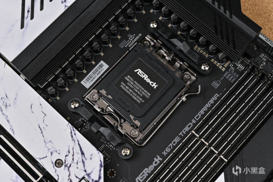 取出主板,华擎 X670E Taichi Carrara 采用黑色 PCB 设计,表面覆盖了大量的白色大理石花纹的 Carrara 散热装甲,主板为 8 层 PCB 设计,E-ATX 规格,尺寸为 30.5x26.7cm。