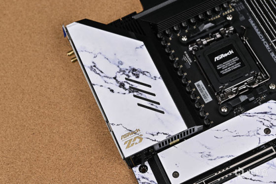华擎X670E TAICHI Carrara 大理石纹理的供电散热模块,左下角印有华擎 20 周年英文金色字体。