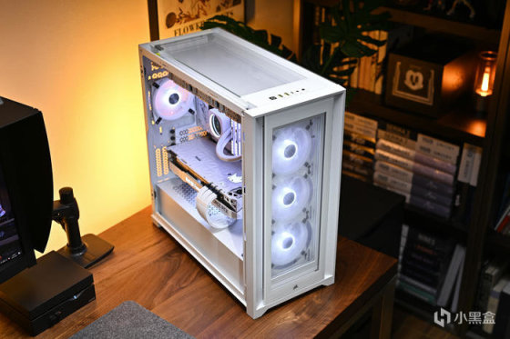 机箱是这次的装机主角:美商海盗船5000X RGB极地白,机箱尺寸:520 毫米 x 245 毫米 x 520 毫米,对比自家其他两个配色(黑、白灰)的同款型号,这次主要做了全白化处理,增加了四款白色的QL120 RGB风扇。主板侧、前面板为高透钢化玻璃侧板。