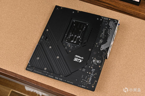 主板背面配备了厚实的铝合金散热装甲,做了凹凸斜纹处理,提高主板强度的同时,更有利于背部散热。