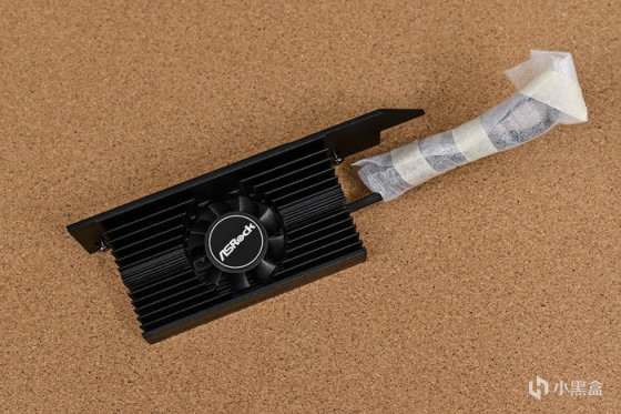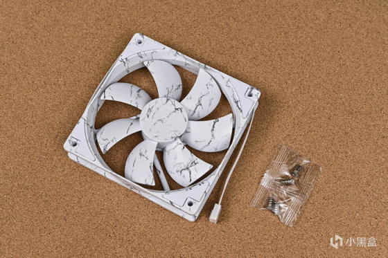 附赠了一颗和主板同样大理石纹理的无光 4Pin 风扇,可在机箱尾部排风使用,转速在800-2500RPM之间可调,最大风量76.21CFM,附赠了四颗银色风扇螺丝。