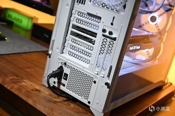 机箱背面最外面也是钢化玻璃,左侧冷排位玻璃掏空预装了菱形进气格栅,右侧钢化玻璃内还有合页式磁吸挡板,遮挡线材。
